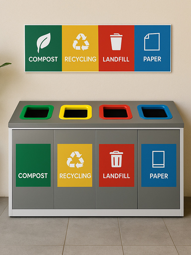 Many facilities — from offices to hospitality venues — have beautiful spaces but lack the waste management infrastructure needed to meet best-practice sustainability standards. We specialise in retrofitting existing sites with multi-stream, colour-coded bin systems, including corflute 4-bin stations and customised signage to Australian standards.